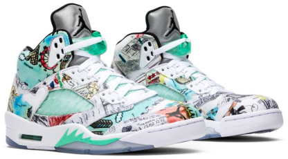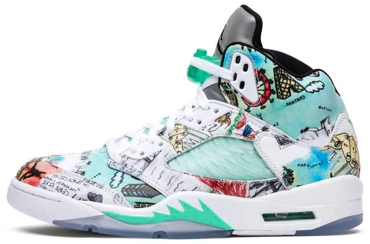 Due to the positive role educators played in Michael Jordan’s formative years . he founded Wings . a scholarship fund dedicated to giving young people equal access to a quality education. The ‘Wings’ edition of the Air Jordan 5 honors this mission by covering the leather upper in doodles and drawings by students from Little Black Pearl . a nonprofit art and design center serving the youth of Chicago’s South Side. The Jordan ‘Wings’ logo appears on the underside of the tongue . next to the statement ‘Everyone Can Fly.’