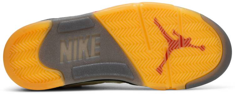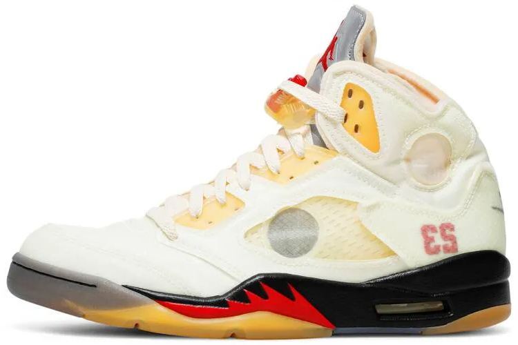 Made in collaboration with Virgil Abloh’s luxury streetwear label . the Off-White x Air Jordan 5 Retro SP 'Sail' represents the follow-up to the partner brands’ black AJ5 from early 2020. This pair makes use of a layered textile upper in a subtle cream finish . complete with circular cutouts on the midfoot . collar and silver reflective tongue. Virgil’s signature flourishes . including printed Helvetica text on the medial side panel . complement ‘23’ and niqdfke Air branding on the heel. A pre-yellowed translucent outsole adds to the sneaker’s vintage aesthetic.