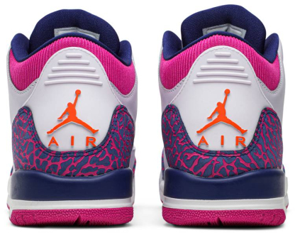 Air Jordan 3 Retro 'Barely Grape' features a white leather upper with the model’s iconic elephant-print overlays in a vibrant blend of purple and fuchsia. The latter hue is applied to the ribbed-textile collar and rubber outsole . while the Jumpman branding that adorns the tongue and heel is rendered in bright orange. The legacy silhouette is anchored by a foam midsole with a visible Air sole unit at the heel.